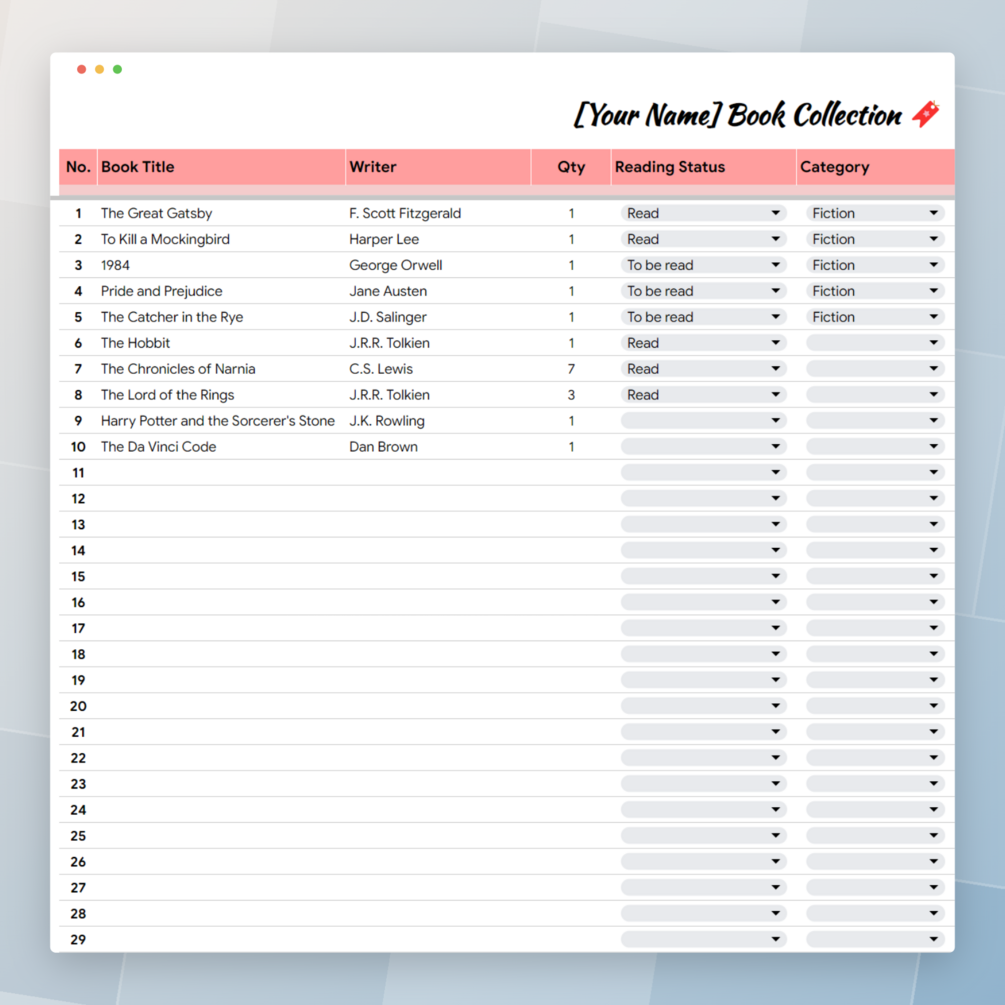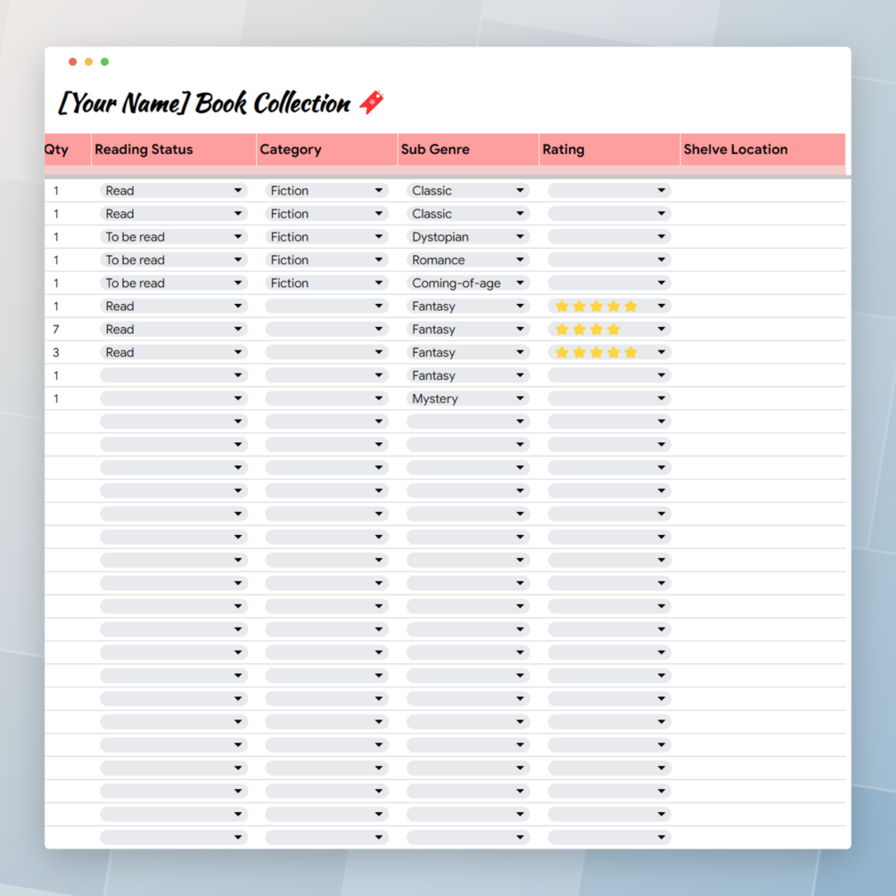 Organize your book collection with ease using the Book Collection Tracker template for Google Sheets! This intuitive tool allows you to catalog your books by title, author, quantity, reading status, category, sub-genre, rating, shelf location, and notes. Whether you're a bibliophile with a vast library or someone building their collection, this template helps you keep track of every book in your possession.