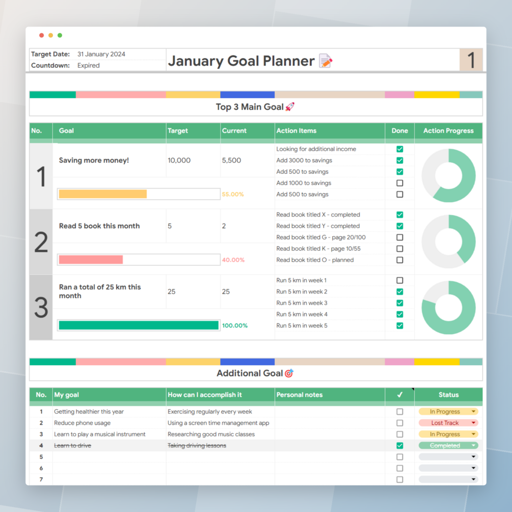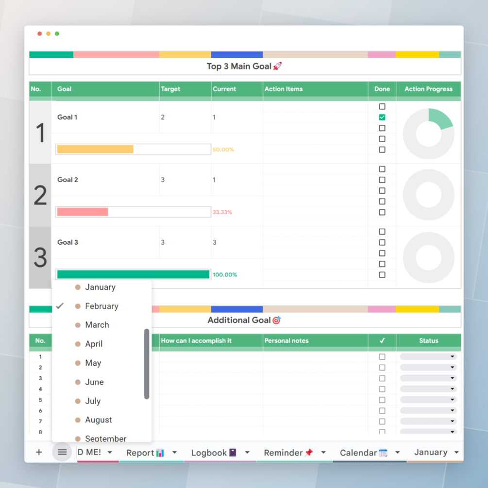 Looking to achieve your life goals more easily and systematically? Try this Personal Goal Planner Template. Designed for a full year, with 12 sheets representing each month from January to December, this goal planner allows you to plan and track your monthly goals clearly and neatly.