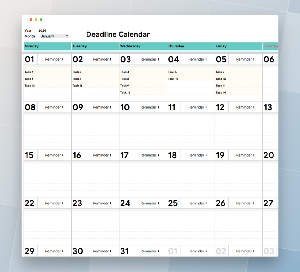 Calendar Sheet: An automated version of the Monthly Task Sheet that helps manage schedules and deadlines. It provides a clear view of daily tasks and deadlines, ensuring the team stays organized and focused.