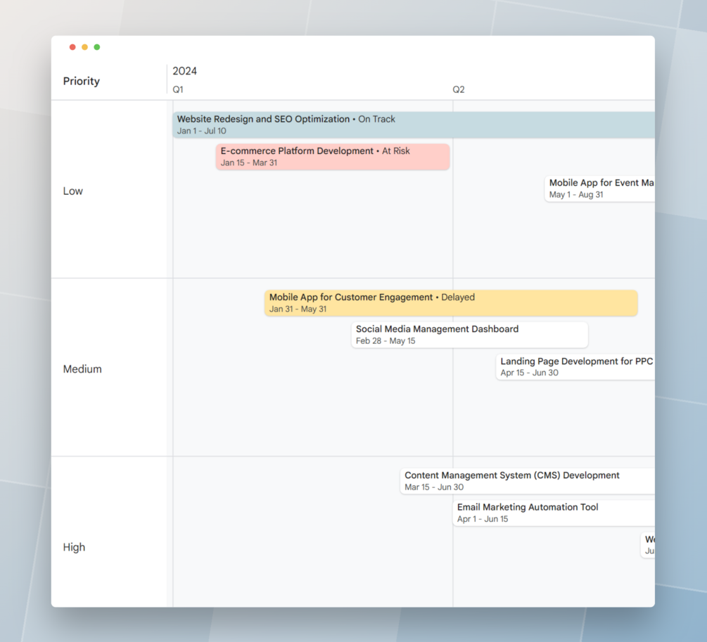 Timeline Sheet: Displays project timelines visually using Gantt charts. It automatically reflects updates from the project sheet, aiding in tracking overall project progress and identifying overlaps.