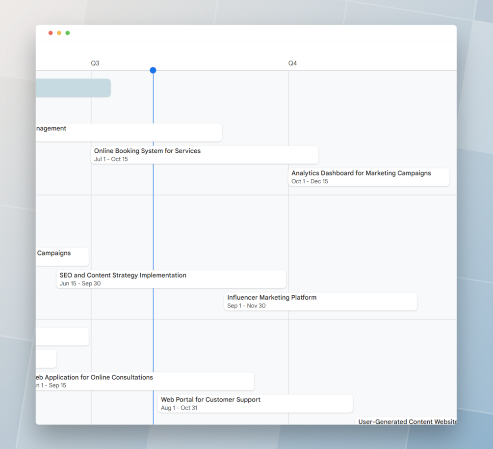 Timeline Sheet: Displays project timelines visually using Gantt charts. It automatically reflects updates from the project sheet, aiding in tracking overall project progress and identifying overlaps.