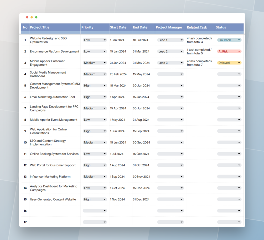 This Google Sheet Project Management Template is designed to facilitate teamwork and boost productivity. Ideal for tracking tasks and real-time reporting, its intuitive design and interconnected sheets make work processes smoother and more efficient.