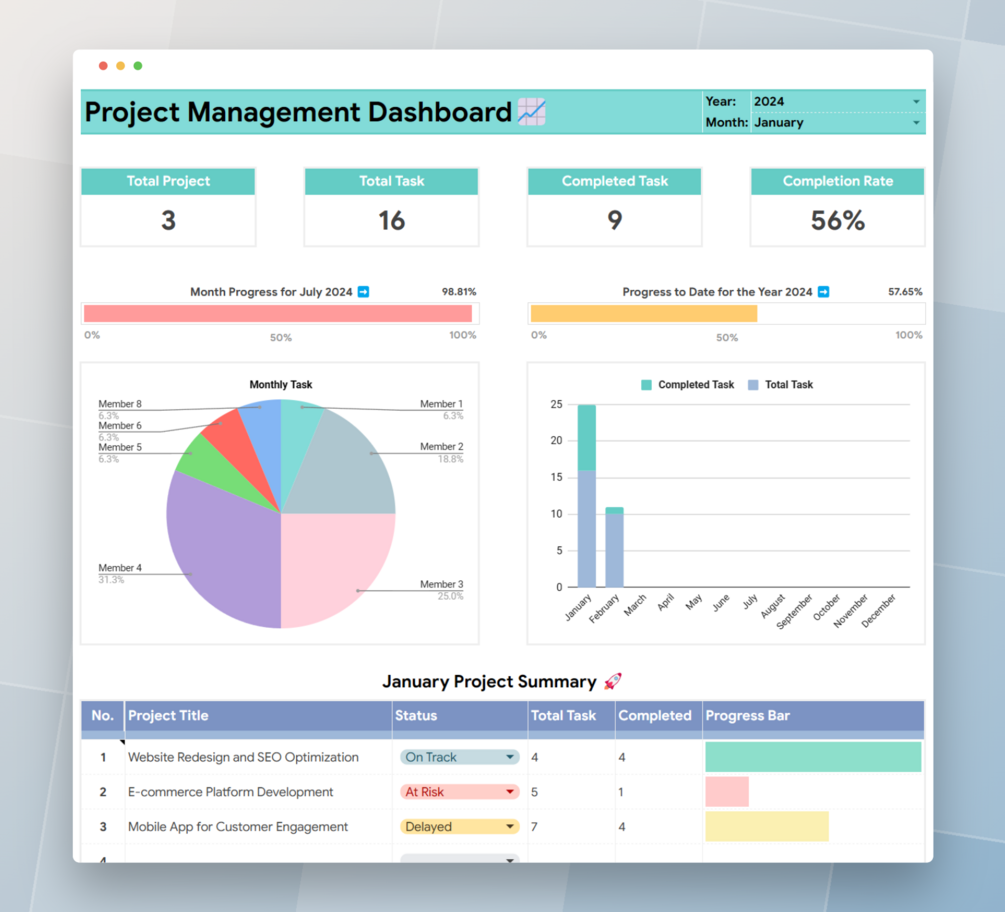 Dashboard Sheet: Offers an overview of team performance in an easy-to-understand format with a monthly drop-down menu. Leaders can see total projects, tasks, completion rates, and progress, helping identify areas needing attention.