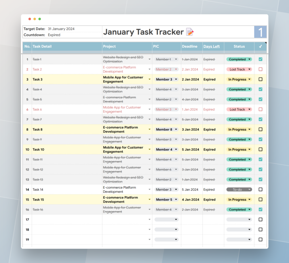 Monthly Task Sheet: Contains 12 sheets for each month, detailing task descriptions, related projects, responsible members, deadlines, and statuses. It helps track completed and ongoing tasks, improving time management and focus.