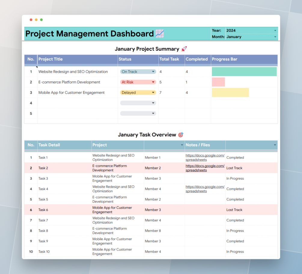 Dashboard Sheet: Offers an overview of team performance in an easy-to-understand format with a monthly drop-down menu. Leaders can see total projects, tasks, completion rates, and progress, helping identify areas needing attention.