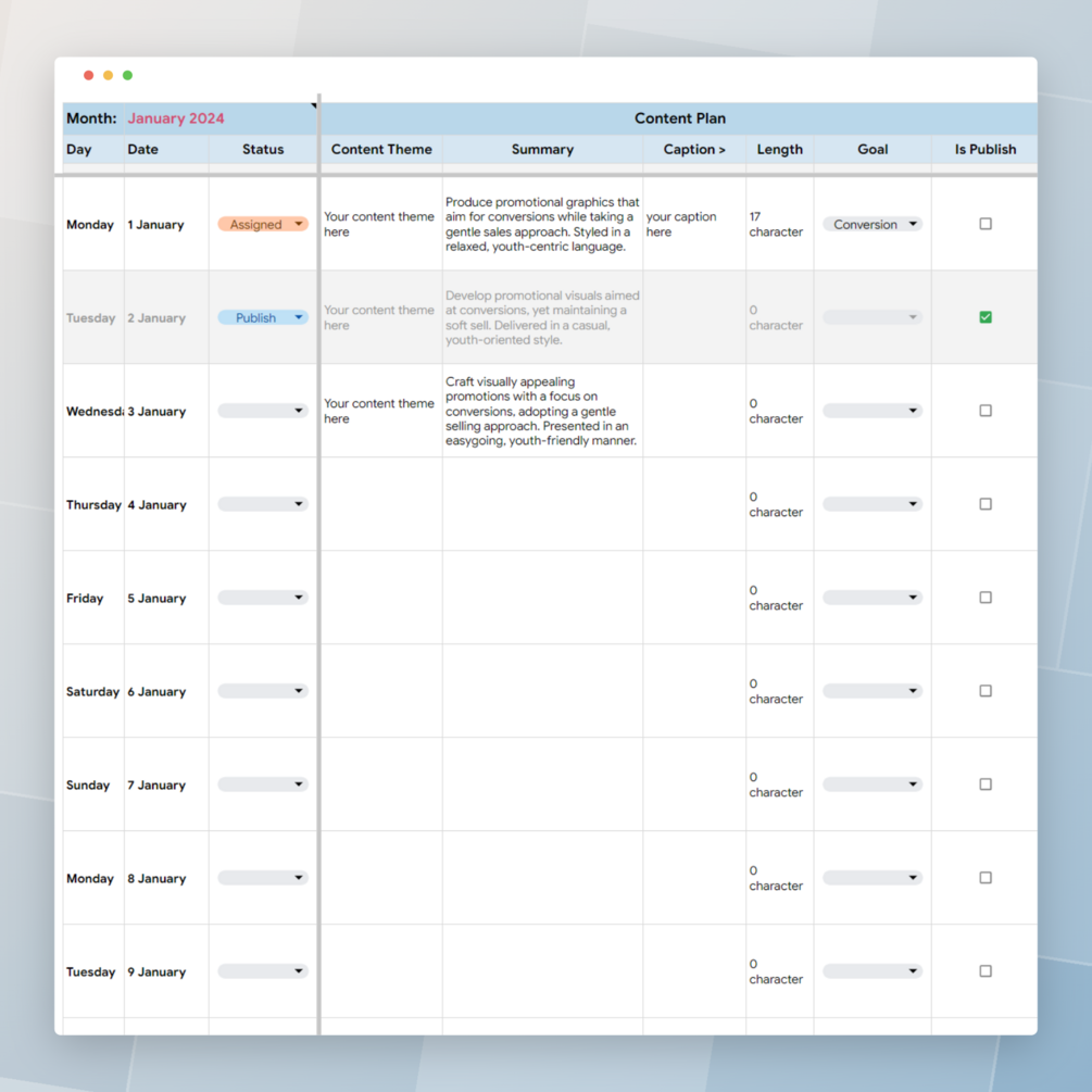Designed for planning social media content for one month, the template automatically adjusts date and day based on the selected month, and includes five main columns: Content Theme, Summary, Caption, Length, and Objective, along with separate columns for copywriting for each social media platform to aid designers in creating visuals.