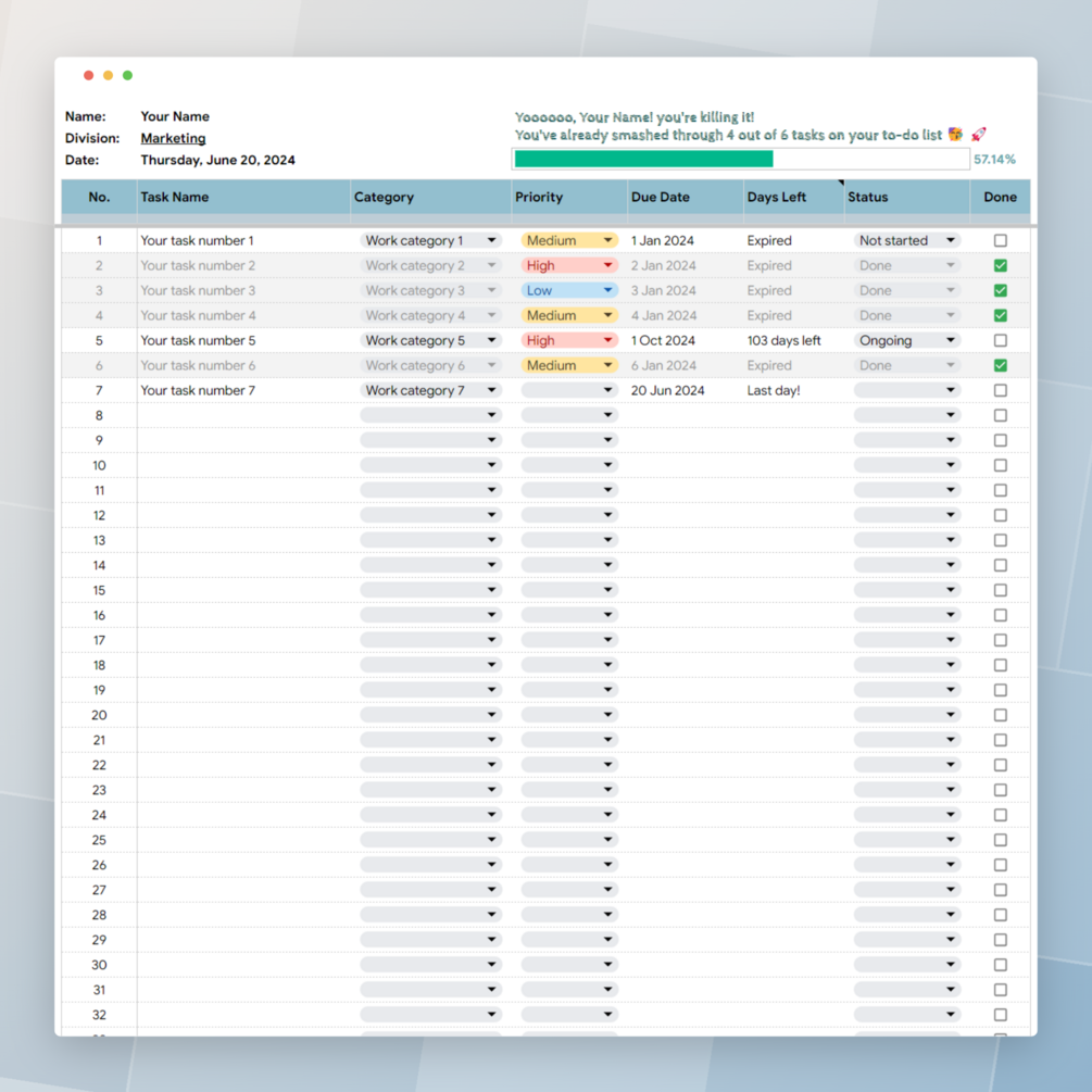 The to-do list sheet helps you organize tasks, record them based on category, priority, and deadline. It features a checkbox function that marks tasks as done when completed, aiding in evaluating task progress and managing work schedules effectively.