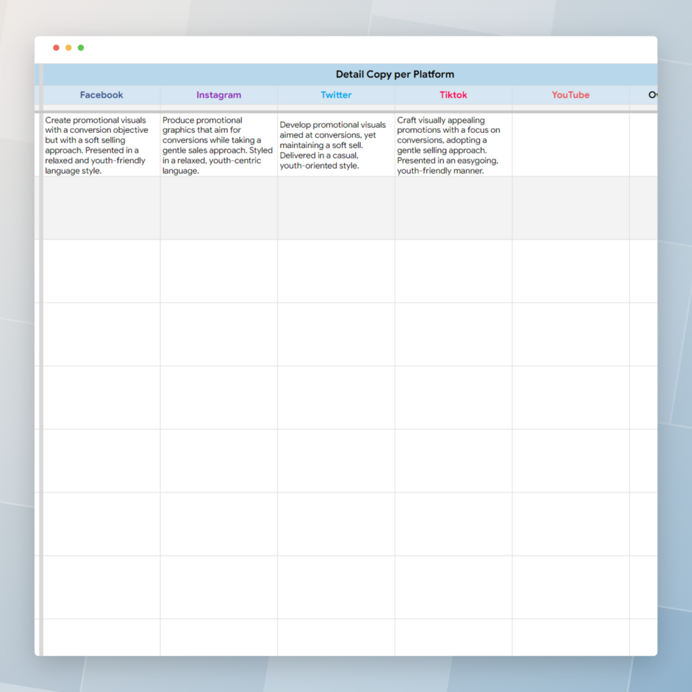 Designed for planning social media content for one month, the template automatically adjusts date and day based on the selected month, and includes five main columns: Content Theme, Summary, Caption, Length, and Objective, along with separate columns for copywriting for each social media platform to aid designers in creating visuals.