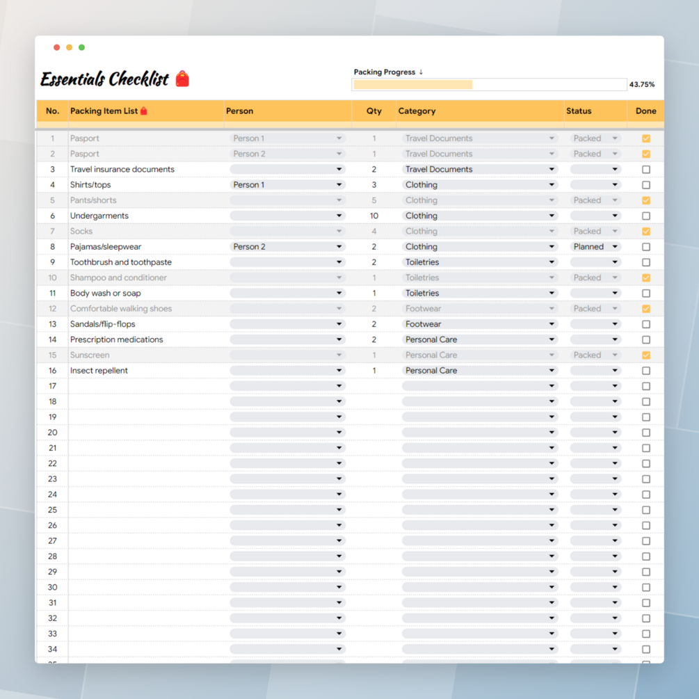 Create a complete list of items to pack for your trip. This sheet ensures you organize everything, from main necessities to often-forgotten small items. By having a detailed packing list, you can avoid the stress of last-minute packing and ensure you have all essentials.