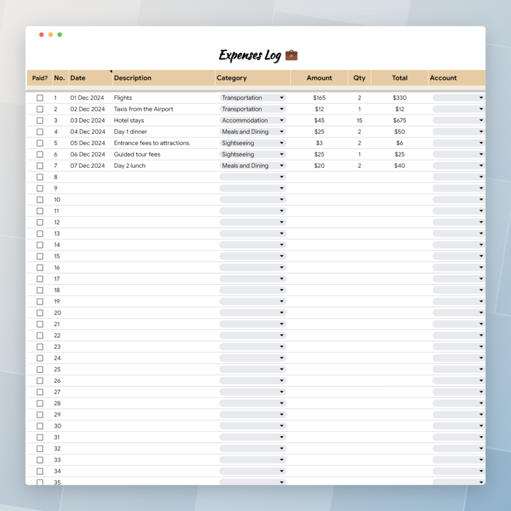 While the Budgeting sheet is for pre-trip planning, this sheet tracks actual expenses during your trip. The data is also displayed in the Overview dashboard for quick reference. It allows you to log daily expenses, providing a clear picture of your spending and helping you stay within budget.